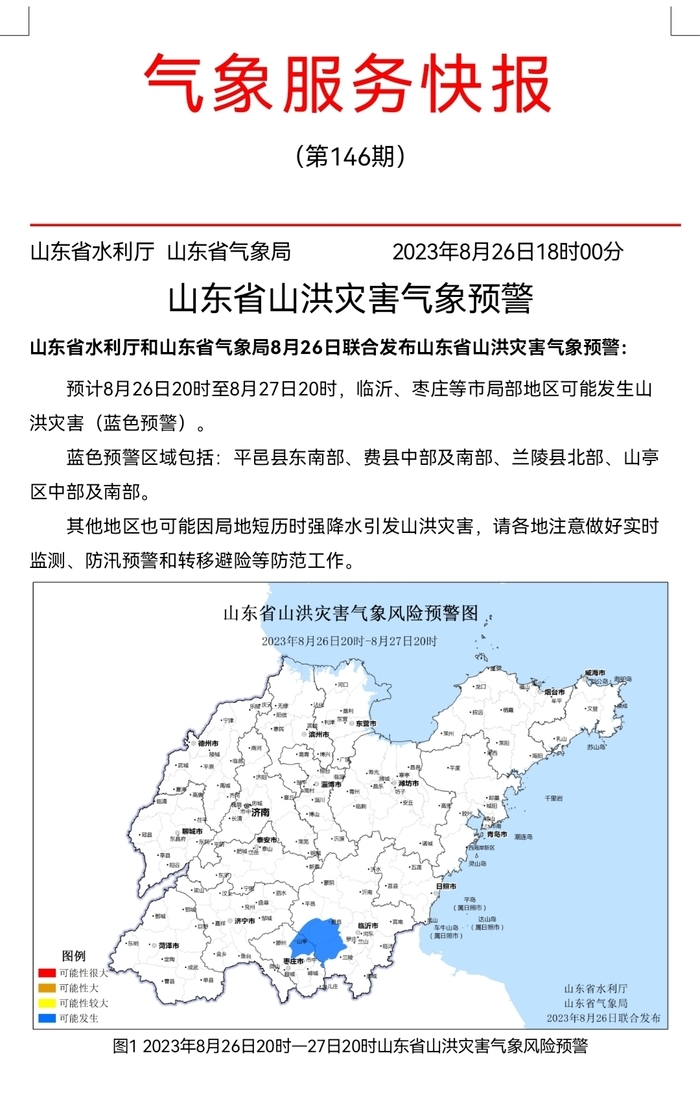 预计8月26日20时至8月27日20时,临沂、枣庄等市局部地区可能发生山洪灾害(蓝色预警)。