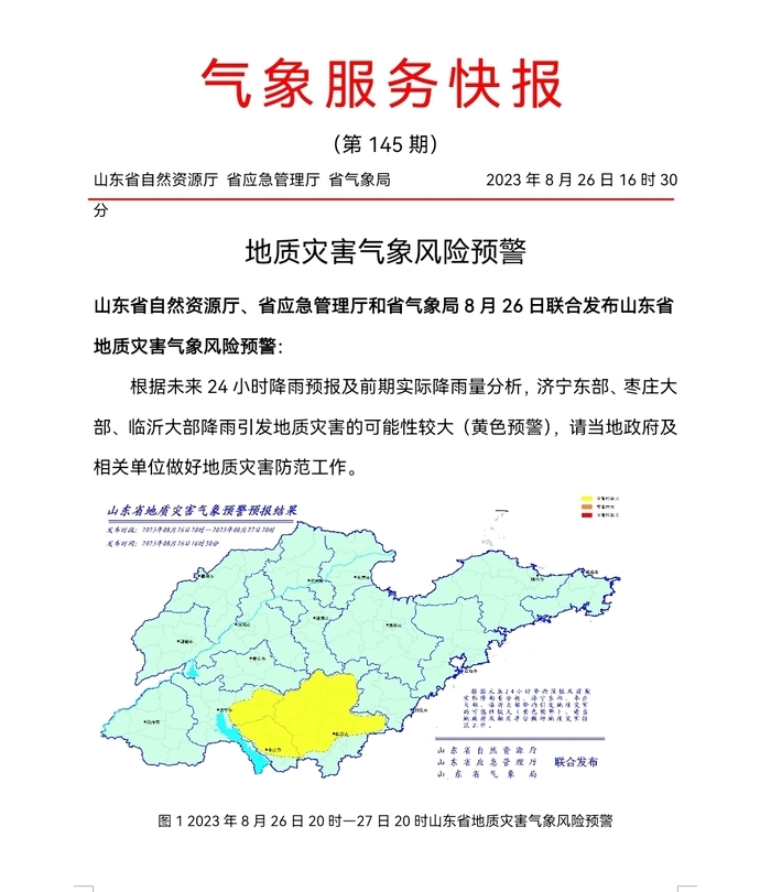 山东省自然资源厅、省应急管理厅和省气象局8月26日联合发布山东省地质灾害气象风险预警: