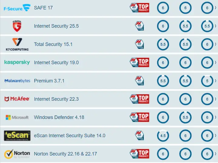 看到了嘛,不带 OEM 引擎是垫底,带上“红伞+BD”双引擎还是垫底,结果惨不忍睹。要知道曾经 360 在国际评测可是第一梯队的,反观微软在 Windows10 自带的 Windows Defender 还是可以的,居然有点小惊喜?显然微软并没有满意,我们再来看看最新的 2019年4月 评测结果: