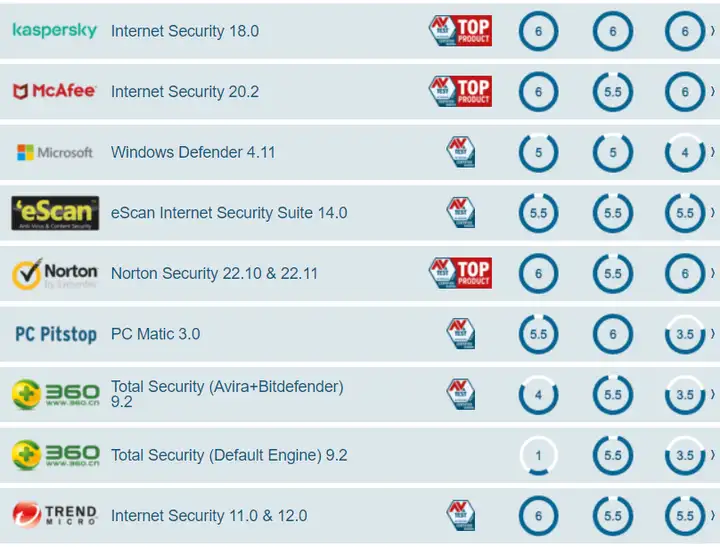 反正安全技术是相同的,360杀毒 的主防也是直接用 360卫士 的文件,那姑且我们就把二者放在一起来看其杀毒能力吧。先看两大国际评测,因 2015年4月 AV-Comparatives(简称 AV-C)官方认为 360 作弊而剥夺测试奖项,而后 360 单方面宣布退出 AV-C 评测,所以我们就只能看 AV-TEST 了。360 最后一次参加 AV-TEST 是在 2017年10月,为什么是最后一次?因为结果太丢人了,此后再未参赛,附上评测结果: