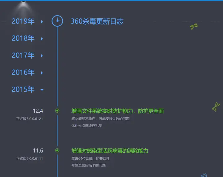 先来看看“360杀毒”这个软件本身是什么现状?如下图所示,这是 360杀毒 官方网站的更新日志。最新的稳定版是 5.0,然后发现 2015年 也是 5.0 ?如果你觉得仅仅只是这样就太天真了,其实 5.0 最早的公测版可以追溯到 2013年(大家可以去卡饭搜下评测就知道时间了)!