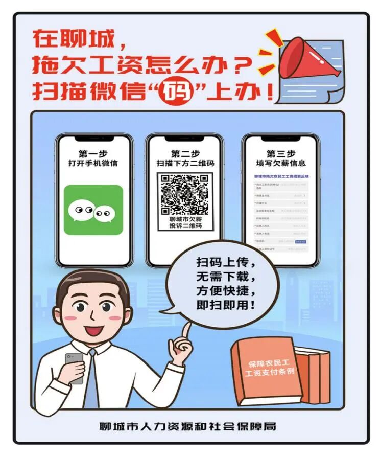 为进一步畅通欠薪维权渠道,聊城市公布欠薪维权举报投诉电话。如果农民工朋友在聊城市遇到欠薪问题,可以根据所从事的工作拨打下面的电话维权或扫欠薪投诉二维码,各级人社、住建、交通、水利等部门将竭诚为您服务,依法维护您的劳动报酬合法权益。欠薪维权“码”上办