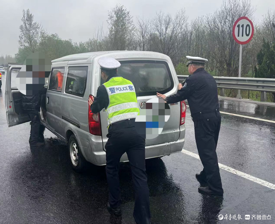 4月4日上午,聊城辖区迎来降雨天气,聊城高速交警茌平大队民警加强视频巡查和路面巡逻,当巡逻至济聊高速公路60公里500米处有一辆小型面包车停在超车道上,情况十分危急,存在巨大安全隐患。民警在安抚驾驶人焦急情绪的同时,一边做好安全防护,利用警车在后方进行喊话,提醒过往车辆减速避让,另一边化身“推车侠”合力将车辆推到应急车道,及时消除了交通安全隐患,确保道路交通安全畅通。