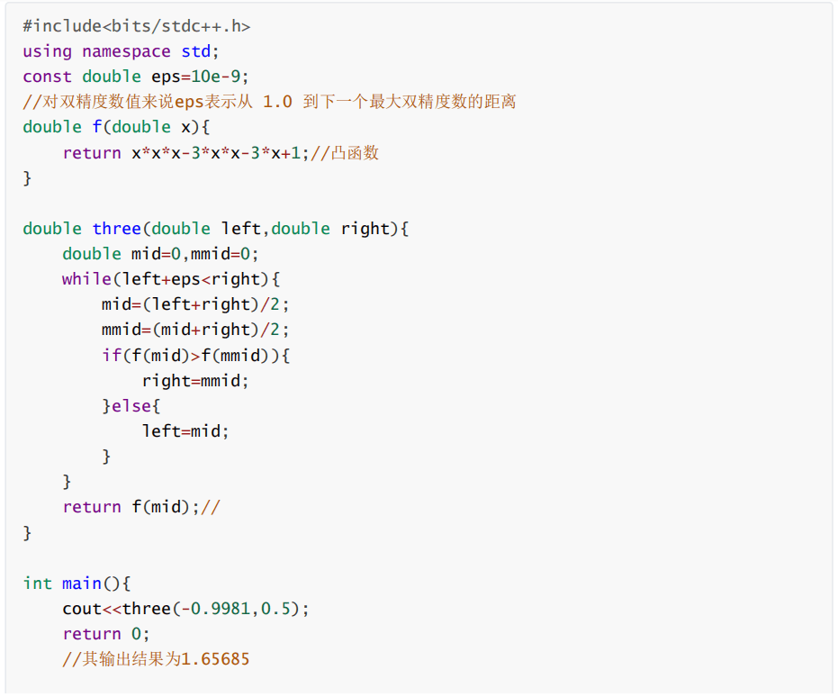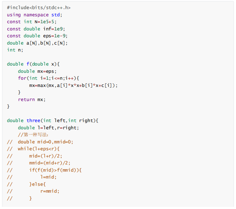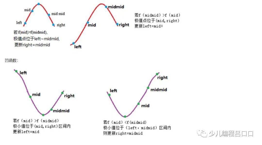 比较mid与midmid谁最靠近最值,只需要确定mid所在的函数值与midmid所在的函数值的大小。当最值为最大值时,mid与midmid中较大的那个自然更为靠近最值。最值为最小值时同理。(画图才是王道,很多不能理解的只需要把图画出来,就很好理解了)