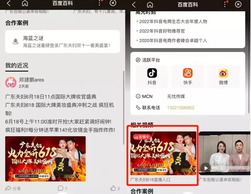 618期间,“广东夫妇”在“我的百科”页面置顶了直播入口,支持一键跳转直播平台,引发数十万网友的关注和讨论,进一步扩大了直播影响力。