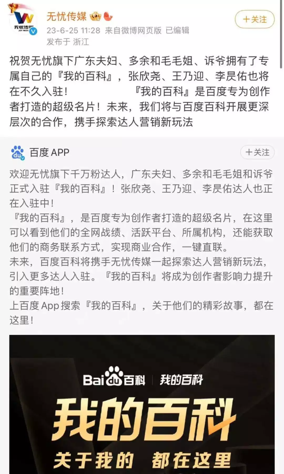 多一个平台就多一层想象空间,更何况“我的百科”背靠10亿百度百科流量。得益于618的流量加持,6月25日,“广东夫妇”所属MCN无忧传媒宣布与百度百科开展深度合作,旗下创作者“多余和毛毛姐”、“诉爷”等多个达人也相继入驻“我的百科”。