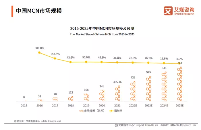 《2022-2023年中国MCN行业发展研究报告》显示,2022年MCN机构数量超过4万家,但市场规模增长率逐年下降,预计到2025年增长点落回个位数。